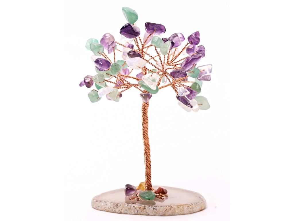🌈 Mixové stromečky štěstí jsou jedinečné dekorace z přírodních minerálů a opalitu, které propojují krásu různých krystalů s jejich energií. Každý stromeček je ručně vyroben z tromlovaných kamínků upevněných na větvičkách z měděného drátu a zasazen do pevné achátové základny, která symbolizuje stabilitu a ukotvení.