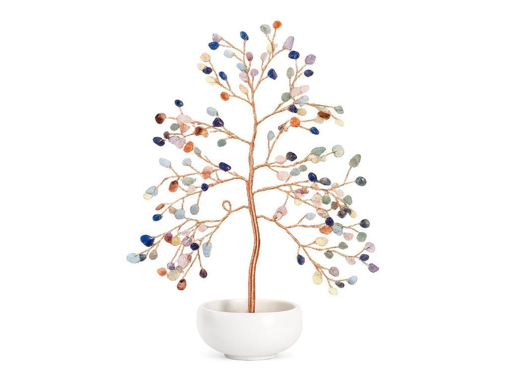Jemná dekorace Stromu života z mixu přírodních minerálů, která spojuje krásu barevných kamínků s tradiční symbolikou růstu, stability a harmonie. Koruna stromku je tvořena drobnými minerálními kamínky v různých odstínech, díky čemuž působí živě, elegantně a originálně.