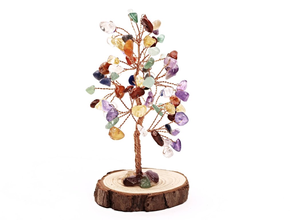 Tento ručně vyráběný strom života z měděného drátku a přírodních minerálů je krásným symbolem růstu, stability a energie. Jeho větve zdobí barevný mix tromlovaných kamenů, které v sobě nesou sílu přírody a harmonizační účinek na tělo i mysl.