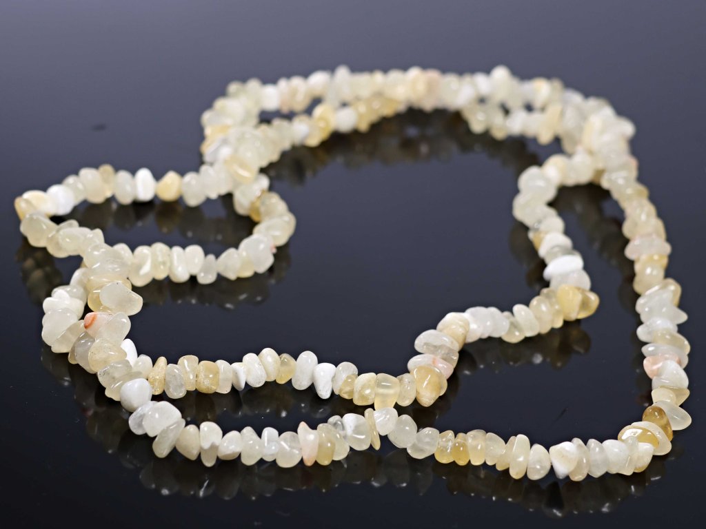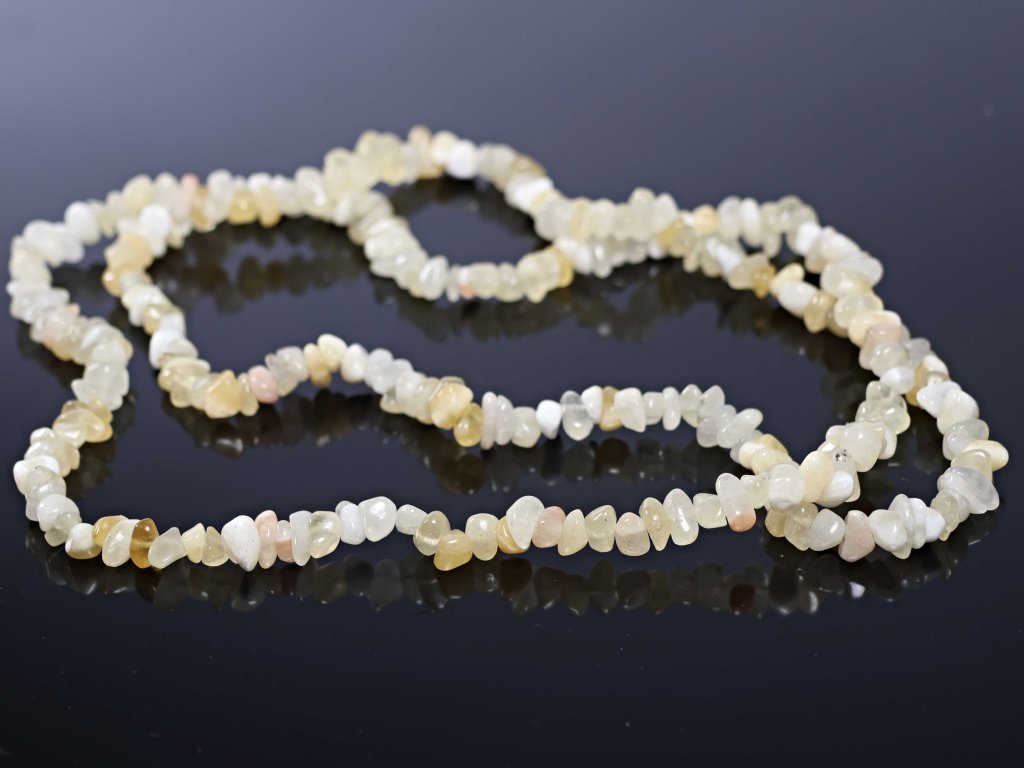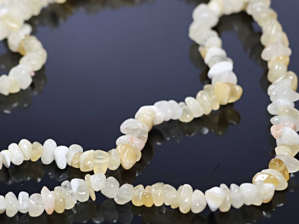 Elegantní náhrdelník z přírodního kalcitu, vyrobený ze sekaných, jemně tromlovaných kamínků o velikosti cca 5–8 mm.