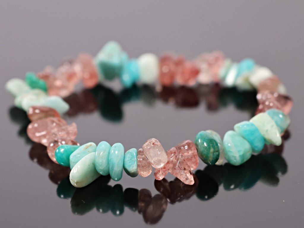 Jemný elastický náramek z přírodních kamenů, tvořený drobnými čipy amazonitu a jahodového křemene. Spojení svěžích zeleno-tyrkysových tónů amazonitu s jemně růžovým jahodovým křemenem vytváří harmonický, klidný a přirozený vzhled. Každý náramek je originál díky přirozené kresbě, tvaru a barevnosti jednotlivých kamenů.