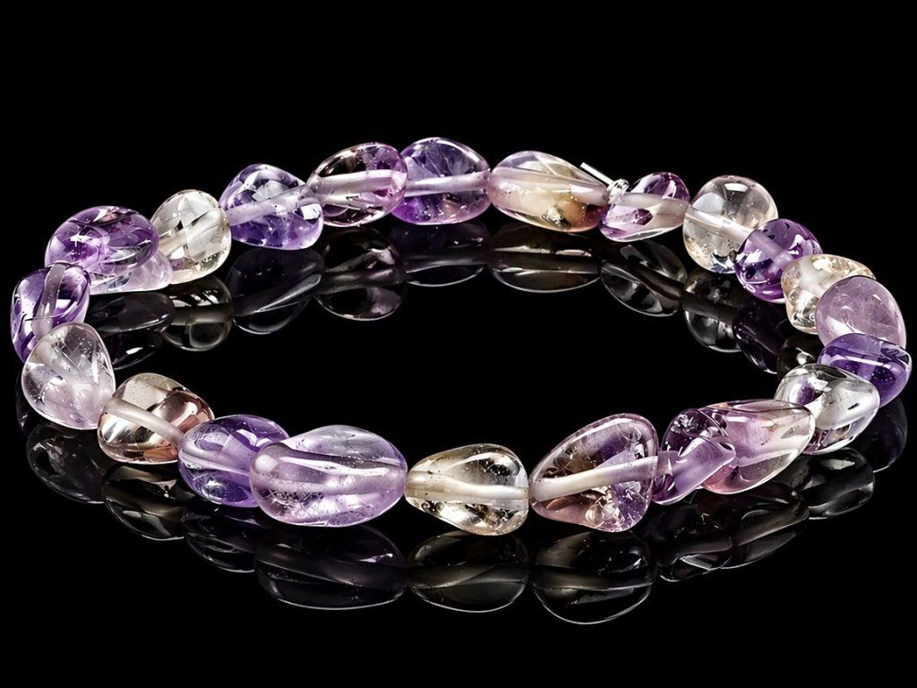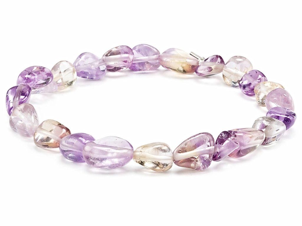 Stylový náramek z přírodního ametrínu zaujme svou jemnou a přitom nepřehlédnutelnou barevností. Ametrín je výjimečný kámen, ve kterém se prolínají něžné fialové, zlatavé, medové i čiré odstíny, díky čemuž působí každý náramek velmi elegantně a originálně. Leštěné valounky krásně vyniknou na ruce a náramek se snadno kombinuje s běžným i slavnostnějším outfitem.