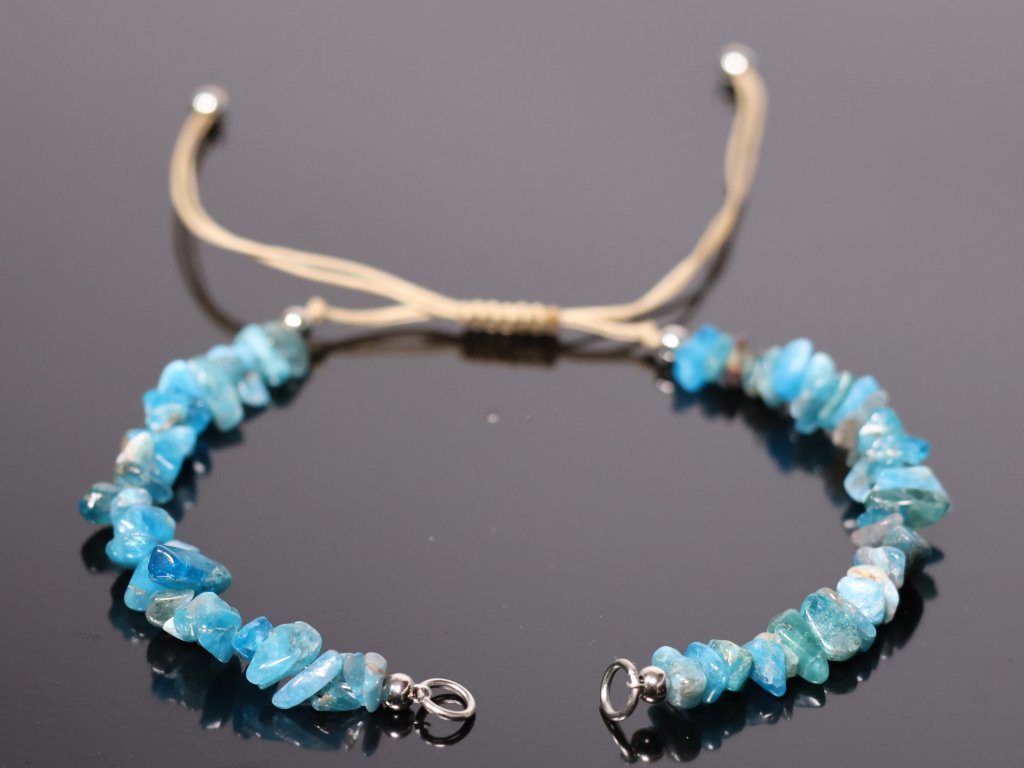 Tento šňůrkový náramek ve stylu Shamballa je krásným základem pro vlastní tvorbu 💙. Přední část zdobí přírodní chipsy apatitu v osvěžujících modrých odstínech, které působí lehce, čistě a přirozeně. Díky posuvnému uzlu si náramek snadno přizpůsobíte velikosti zápěstí, takže je pohodlný na nošení a univerzální.