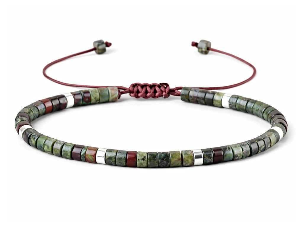 Jaspis s epidotem je oblíbený pro svůj originální a nadčasový vzhled, který snadno sladíte s běžným i elegantnějším outfitem. Typický je kombinací zemitých tónů s odstíny zelené, které vytvářejí jedinečnou přírodní kresbu každého kamene. Přirozený charakter může zahrnovat jemné barevné přechody, skvrny i drobné odchylky, díky nimž je každý náramek originál. Náramek je vhodný pro každodenní nošení i jako stylový doplněk pro zvláštní příležitosti.