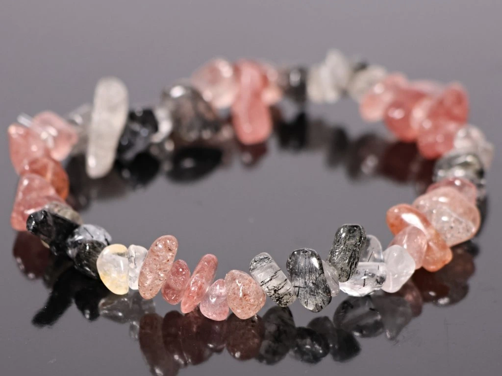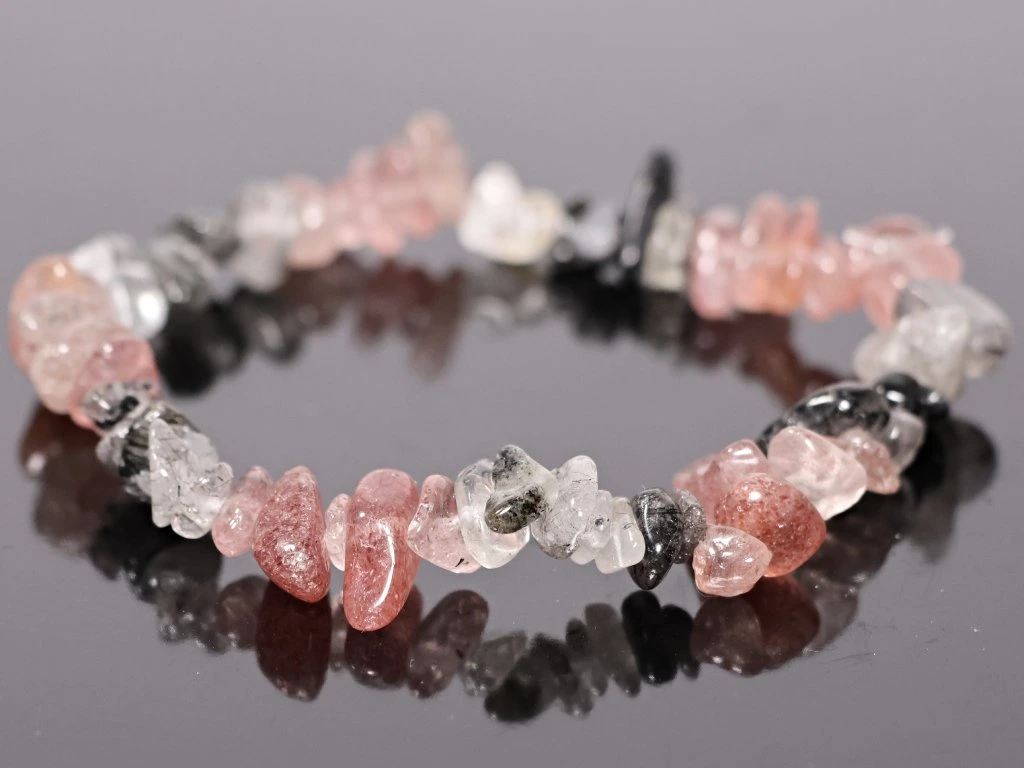 Pružný náramek z tromlovaných kamínků (Křemen jahodový a Křišťál s turmalínem)