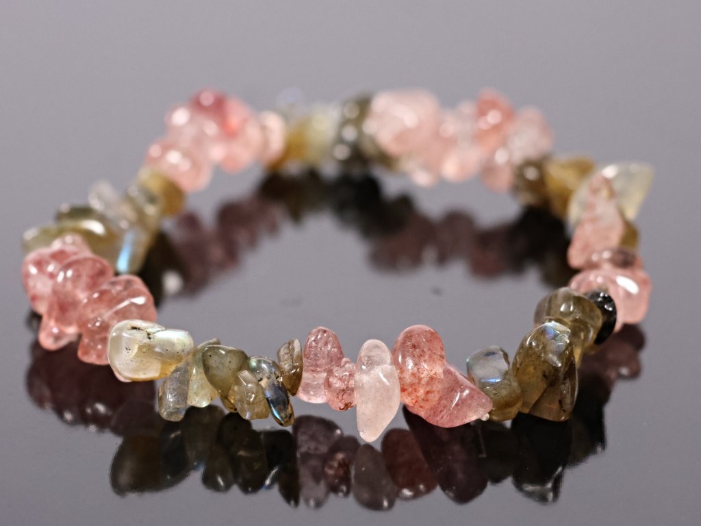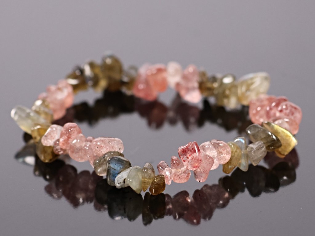 Jemný elastický náramek z přírodních kamenů, tvořený drobnými čipy labradoritu a jahodového křemene. Spojení tajemných šedo-modrých tónů labradoritu s jemně růžovým jahodovým křemenem vytváří harmonický, vyvážený a přirozeně elegantní vzhled. Každý náramek je originál díky jedinečné kresbě, tvaru a barevnosti jednotlivých kamenů, často s jemnými odlesky typickými pro labradorit.