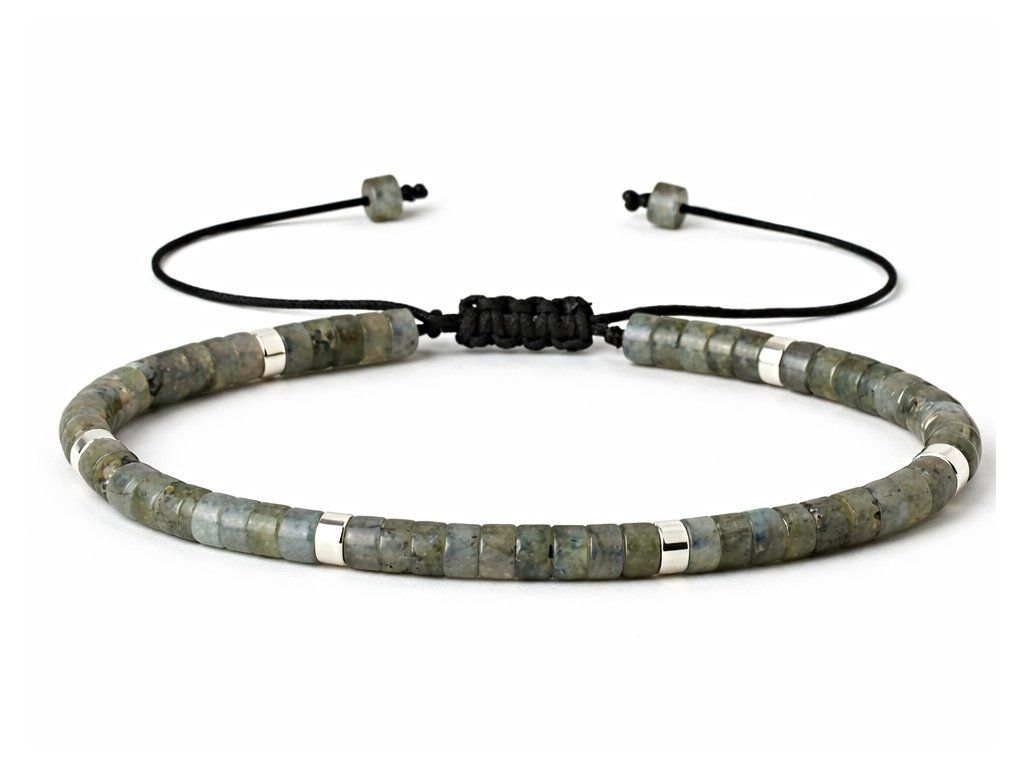 Shamballa náramek z labradoritu zaujme svým tajemným vzhledem, přirozenou strukturou kamene a jedinečnými odlesky. Jemné sloupkové korálky z labradoritu doplňují kovové korálky ve stříbrném odstínu a pletená nylonová šňůrka. Díky posuvnému zapínání ve stylu Shamballa je náramek roztažitelný, pohodlný na nošení a snadno nastavitelný podle velikosti zápěstí.