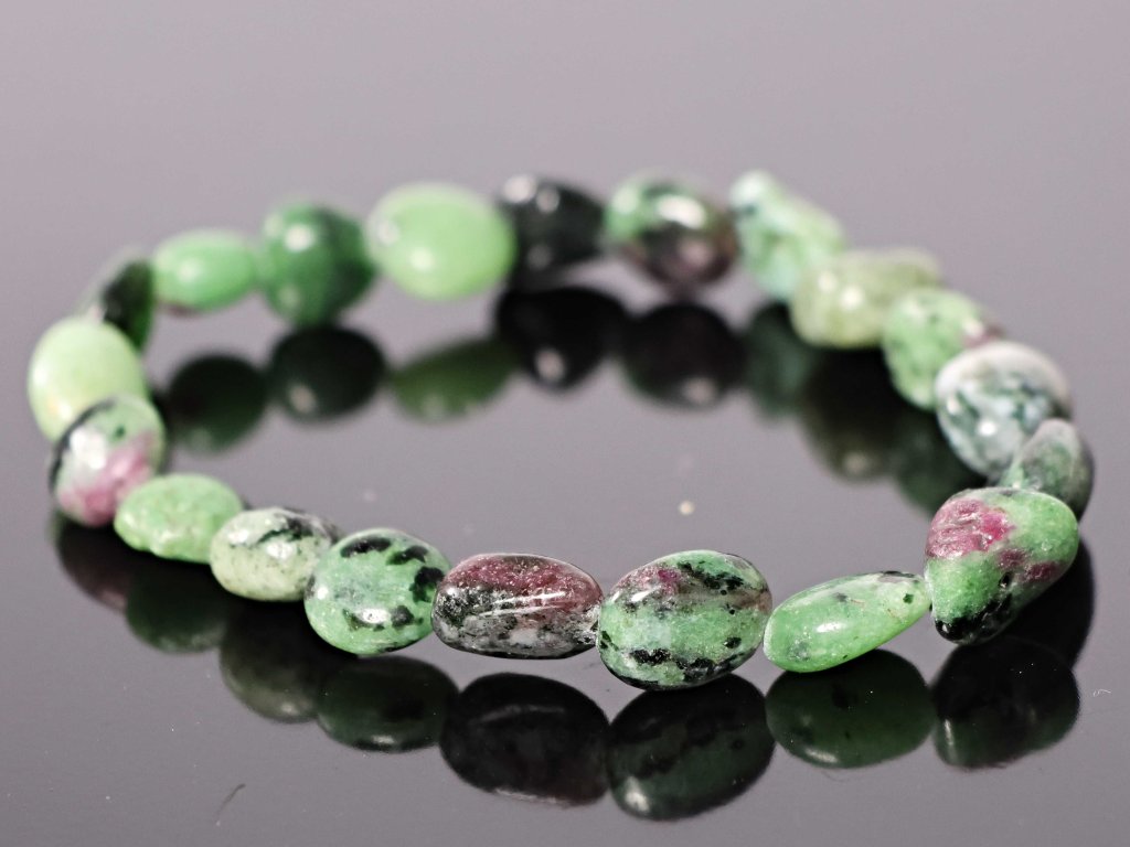 Důležité: Vzhledem k přírodnímu charakteru, nepravidelnému tvaru valounků a unikátnímu rozložení Rubínu v Zoisitu je každý náramek naprostý originál. Tvar, velikost, poměr barev (růžovo-červená/zelená/černá) a kresba jednotlivých kamínků se bude výrazně lišit.