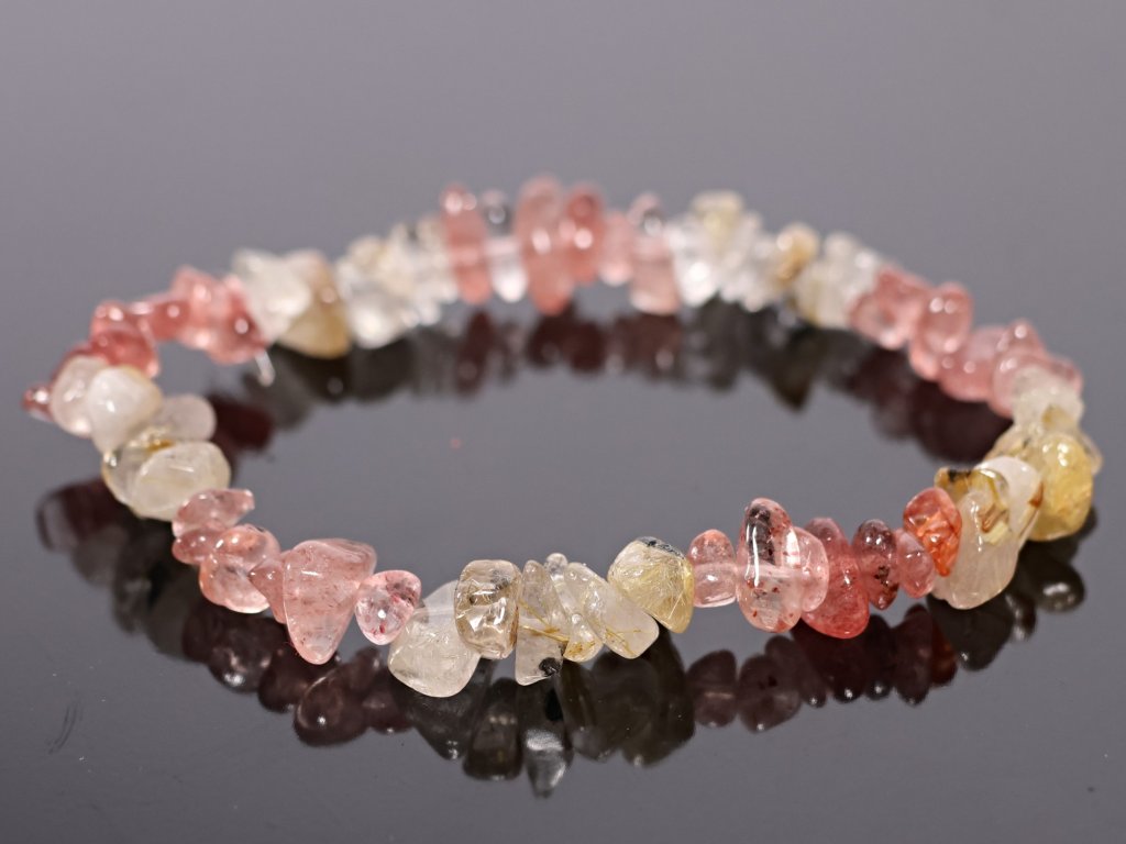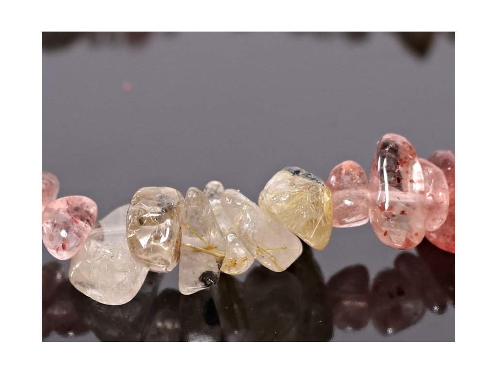 Jemný elastický náramek z přírodních kamenů, tvořený drobnými čipy sagenitu – křišťálu se zlatým rutilem a jahodového křemene. Kombinace průsvitného křišťálu s jemnými zlatými rutilemi a růžově tónovaného jahodového křemene vytváří harmonický a přirozený vzhled. Každý náramek je originál díky přirozené kresbě a zbarvení kamenů.