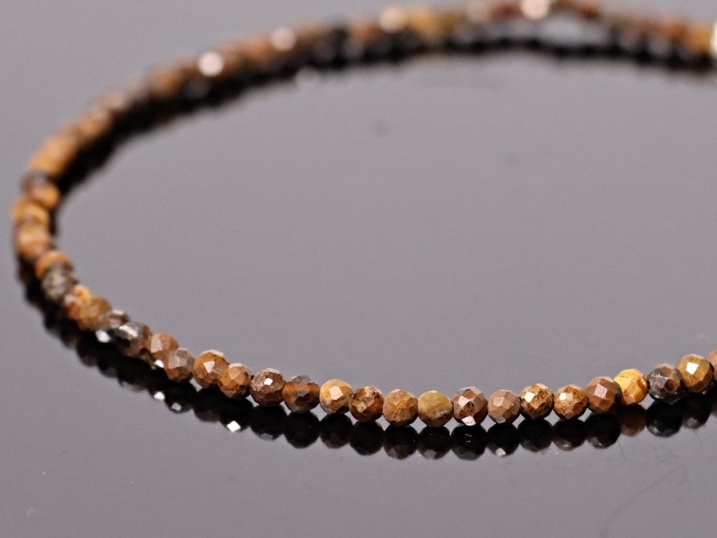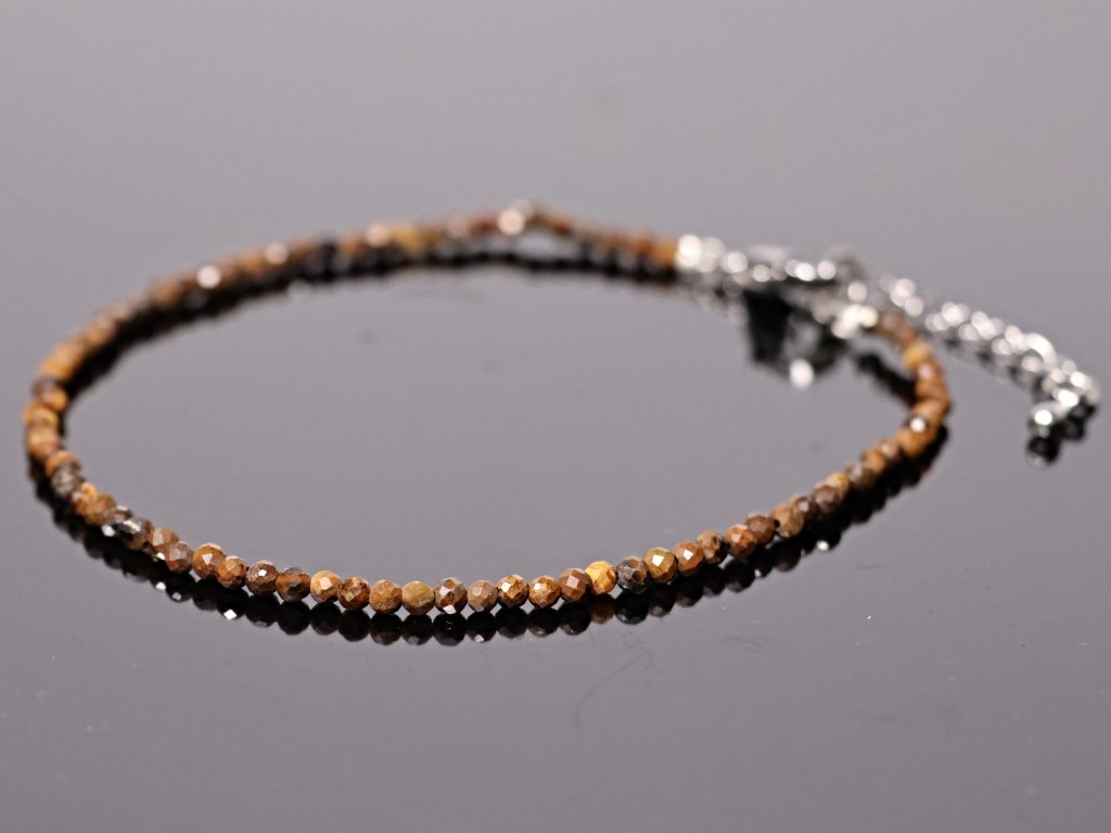 Jemný náramek z přírodního tygřího oka zaujme typickými zlatohnědými odlesky a elegantním leskem minerálu. Fazetované kuličky o velikosti cca 2,5 mm dodávají náramku jemný třpyt a decentní vzhled, díky kterému se skvěle hodí ke každodennímu nošení i ke kombinování s dalšími náramky.