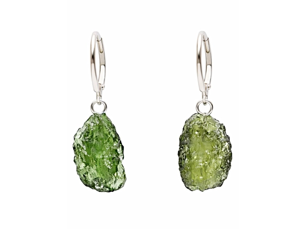 Elegantní náušnice s přírodním vltavínem, které zaujmou svou jedinečnou strukturou a typickou zelenou barvou tohoto výjimečného kamene. Surové vltavíny mají krásný přírodní povrch a nepravidelný tvar, díky čemuž je každý pár náušnic originální.