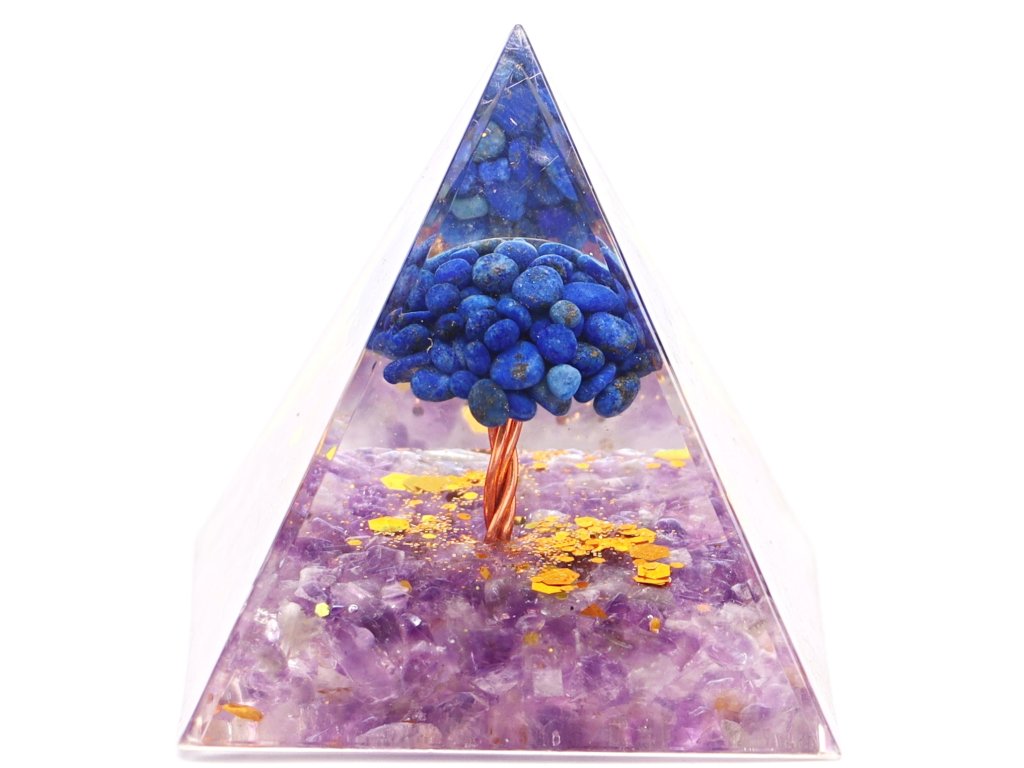 Orgonitová pyramida 5×5 cm – Ametystové kameny + Lapis Lazuli stromeček 💜🌳🔵