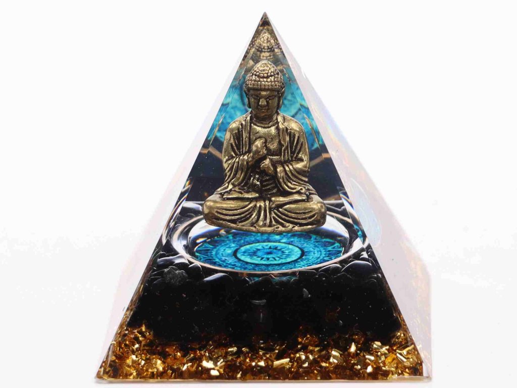 Orgonit pyramida 6x6 cm Buddha + kameny Obsidián #OR049