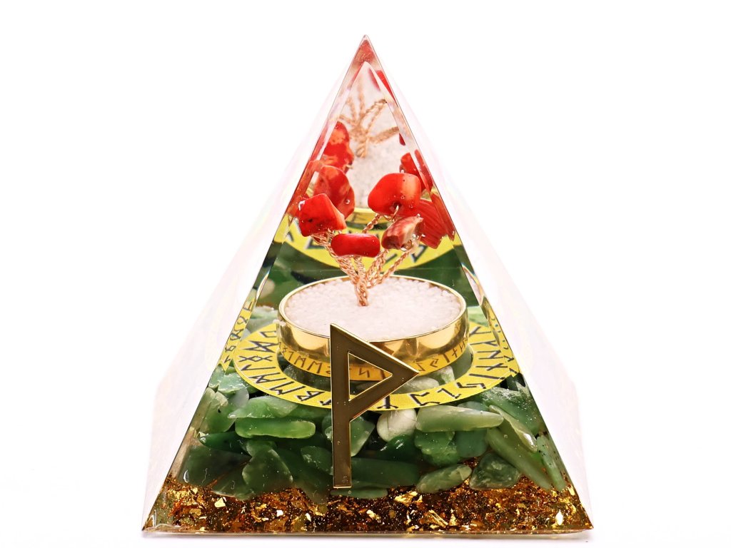 Orgonit pyramida 6x6 cm Jadeit + symbol Runy #OR169