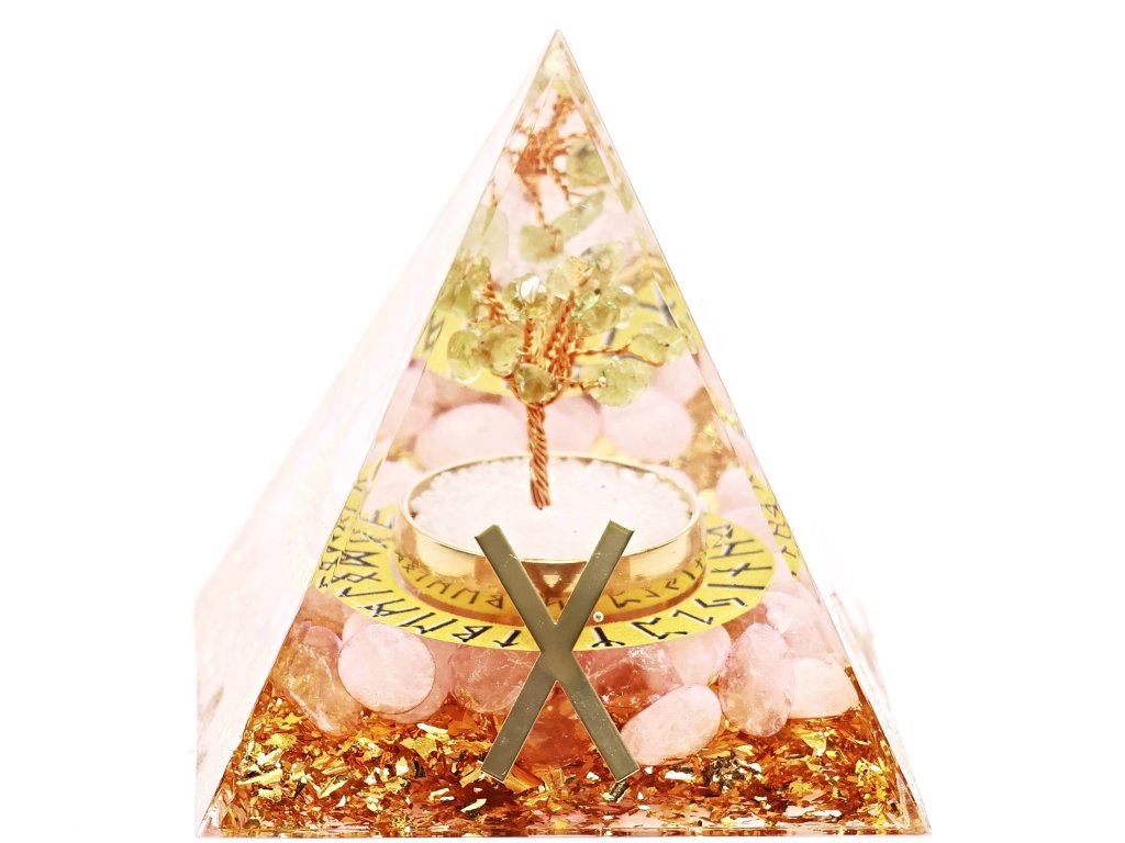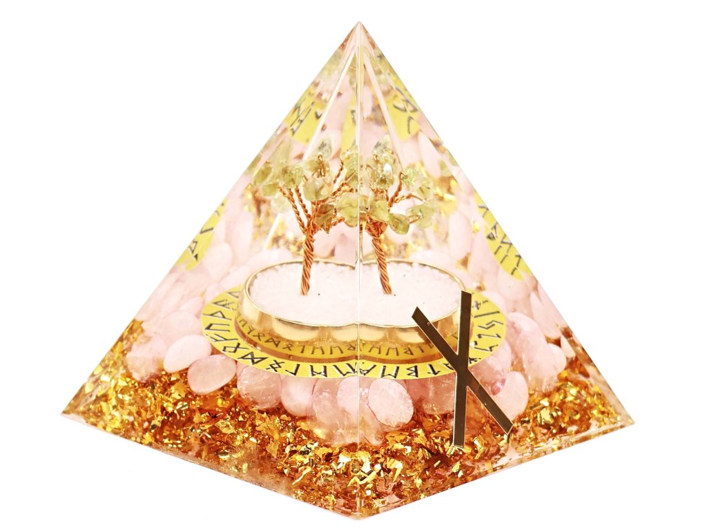 Ručně vyrobená orgonitová pyramida se stromečkem z olivínu je harmonickým spojením přírodní krásy, duchovní symboliky a jemné energie. Její spodní část zdobí světle růžový růženín, který vnáší lásku, klid a emocionální vyrovnanost. Spolu s olivínem podporuje pozitivní atmosféru a pocit vnitřní rovnováhy.