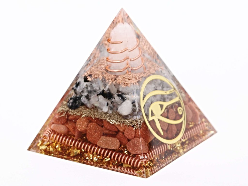 Orgonitová pyramida s růženínovou špicí, měsíčním kamenem a zlatým avanturínem pomáhá eliminovat negativní vibrace, přináší emoční stabilitu a podporuje harmonii a pozitivní naladění.