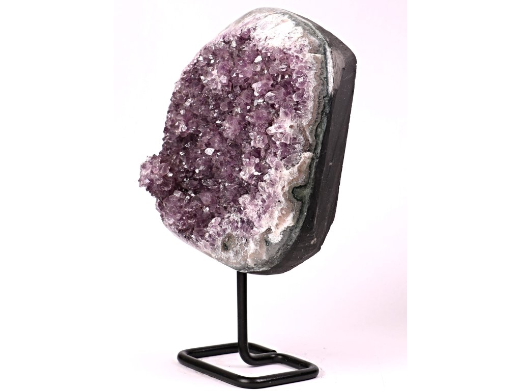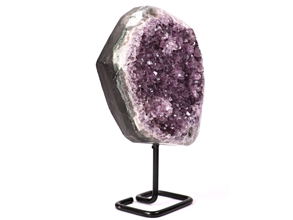 Ametystová drúza vysoké kvality s krystaly fialové barvy na kovovém stojánku