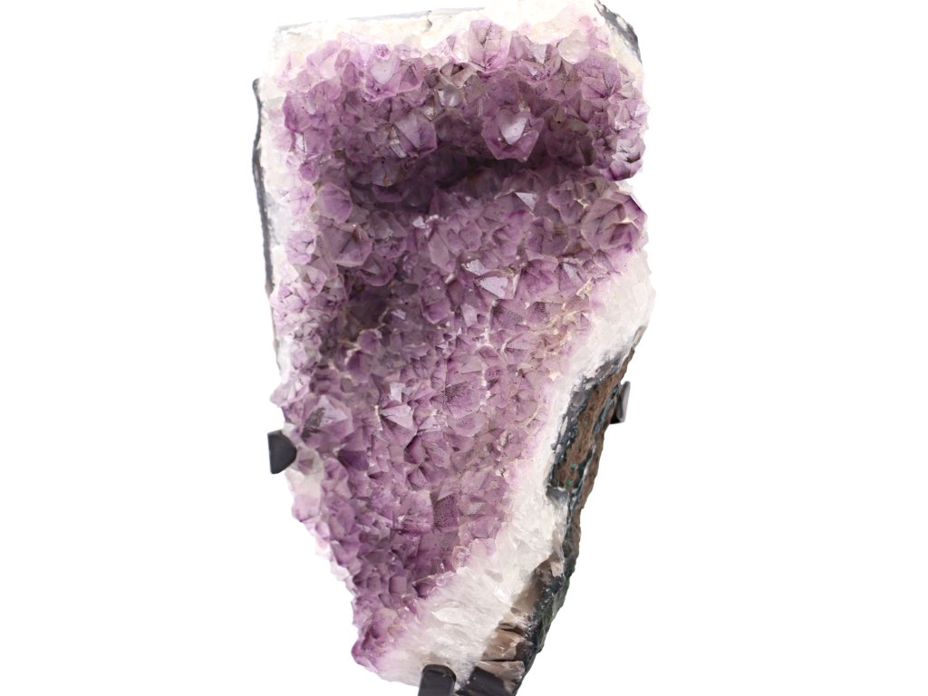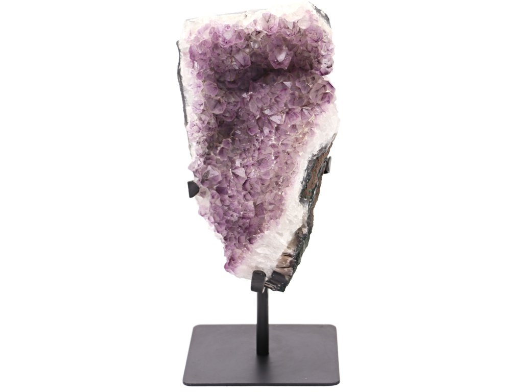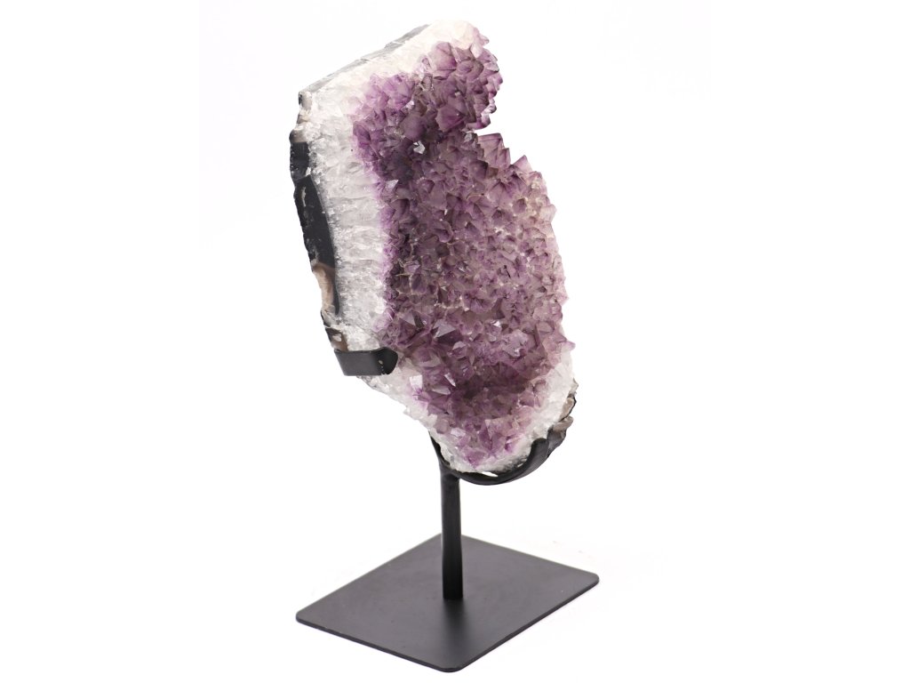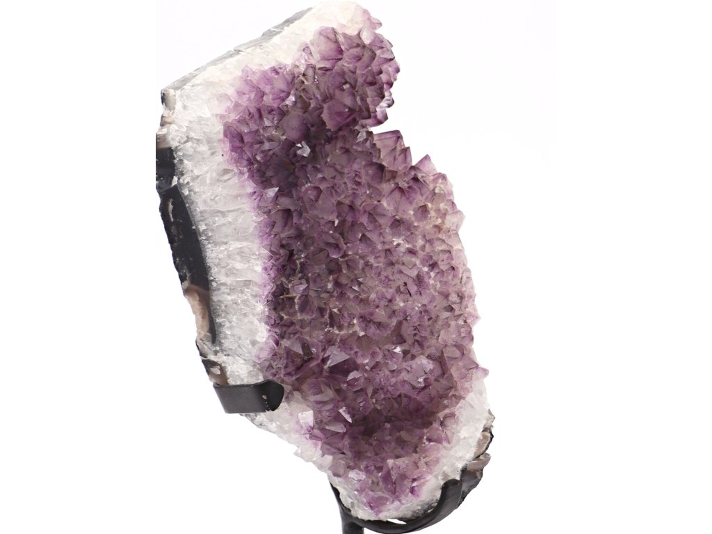 Ametystová drúza vysoké kvality s krystaly fialové barvy na kovovém stojánku