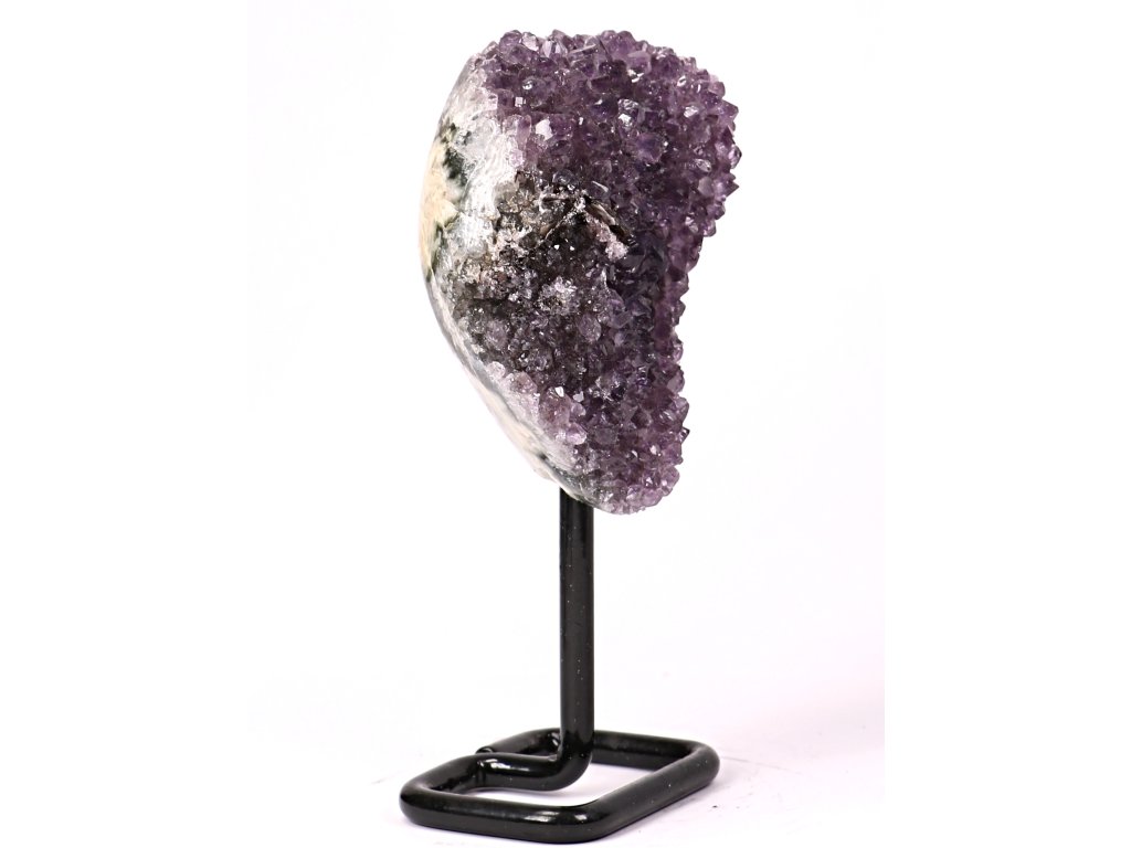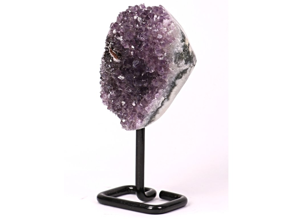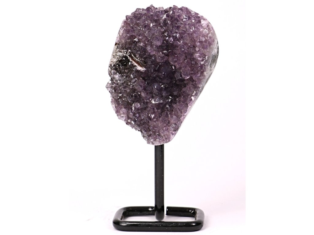 Ametystová drúza vysoké kvality s krystaly fialové barvy na kovovém stojánku