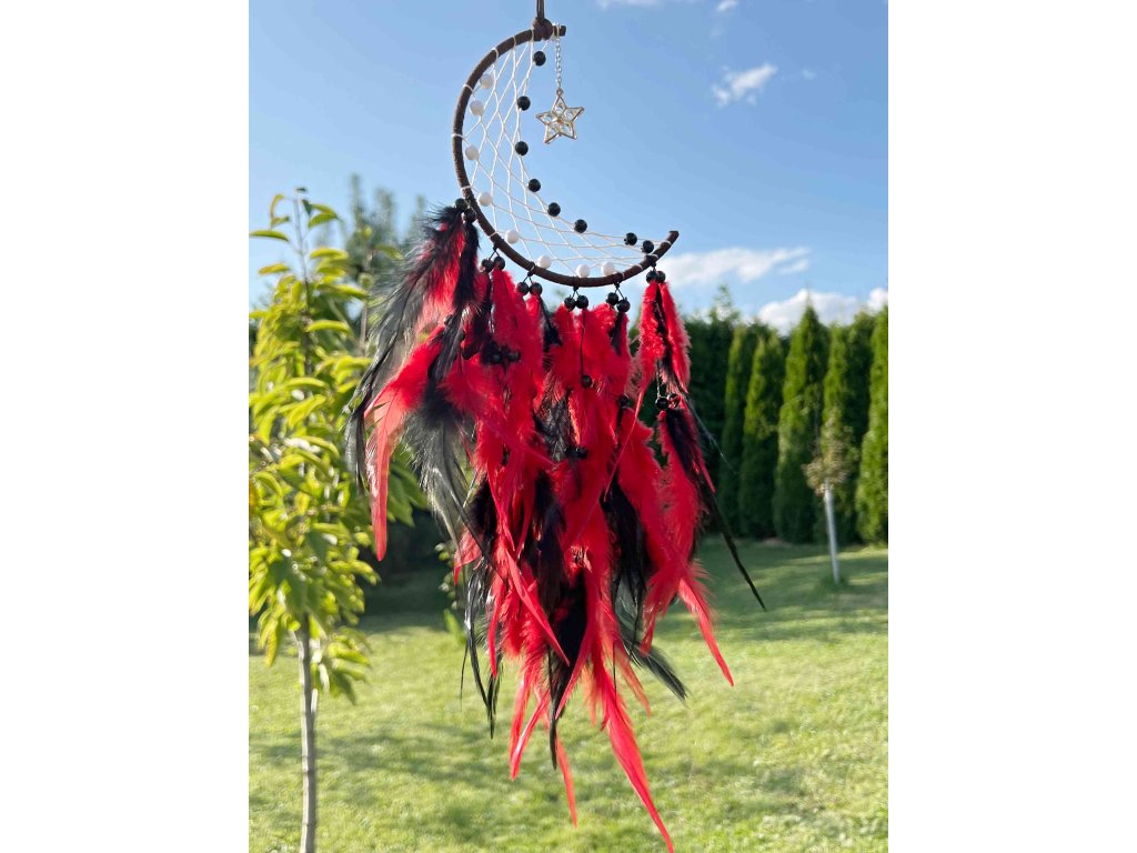 Lapač snů ve tvaru měsíce s červenými a černými pírky #ZB391