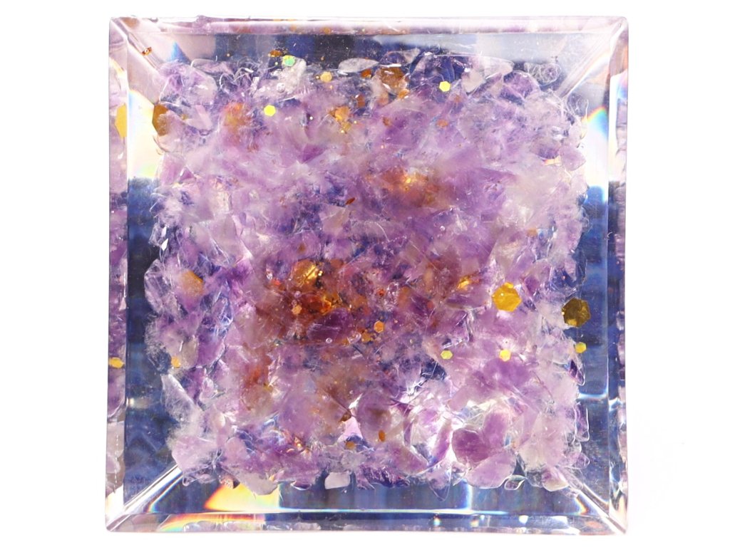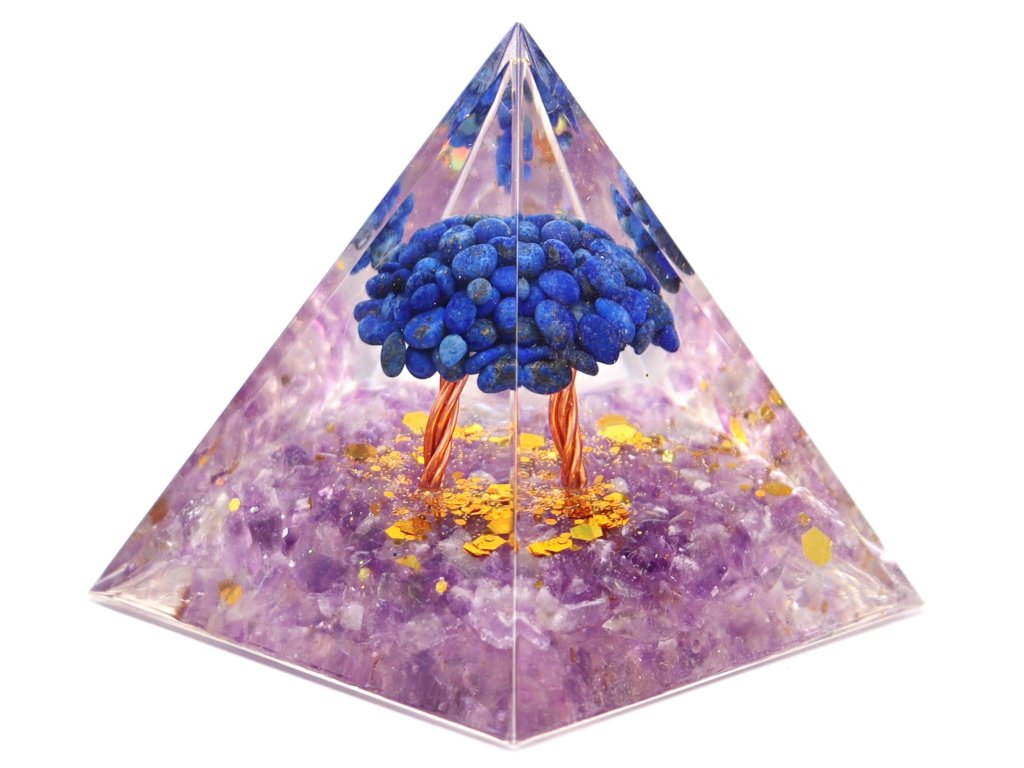 Orgonitová pyramida 5×5 cm – Ametystové kameny + Lapis Lazuli stromeček 💜🌳🔵