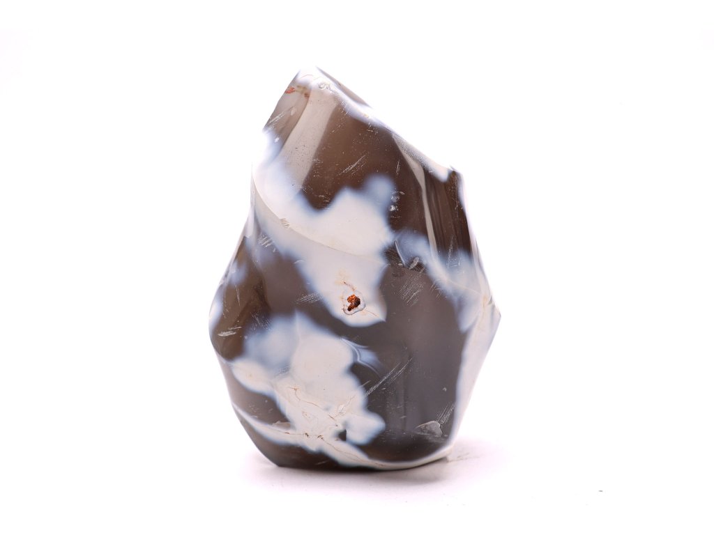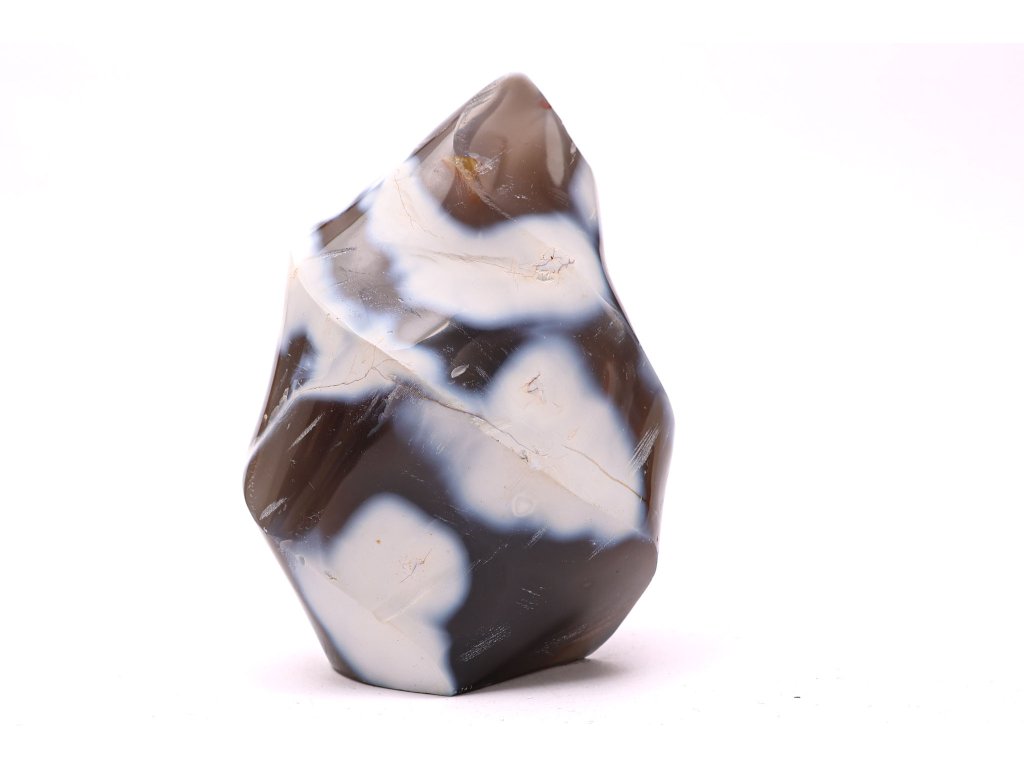 Plamen z přírodního achátu Orca je jedinečný minerál, který upoutá svým výrazným kontrastem černých, šedých a bílých odstínů připomínajících kresbu kosatky. Tento kámen byl ručně opracován do tvaru plamene, díky čemuž se stává nejen harmonizujícím prvkem, ale také originální dekorací pro váš domov či kancelář.