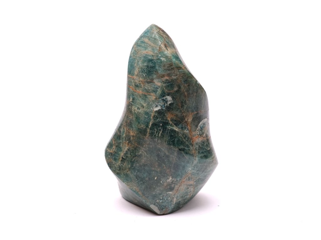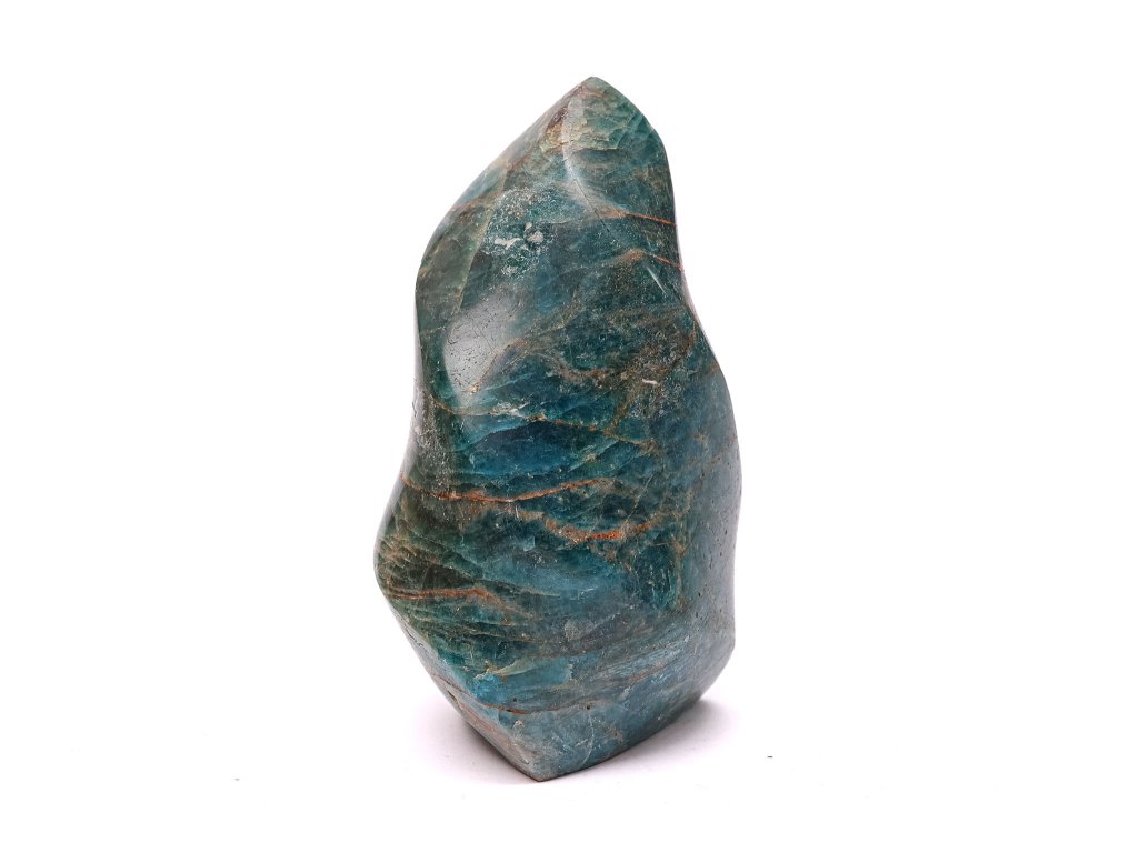 Tento krásně opracovaný plamen z modrého apatitu okouzlí svými živými odstíny modré, které připomínají hloubku oceánu. Plamen jako tvar symbolizuje energii, očistu a transformaci – v kombinaci s apatitovým kamenem působí jako silný zdroj inspirace a vnitřní harmonie. Apatit je známý jako kámen komunikace a sebedůvěry, podporuje tvořivost, motivaci a pomáhá otevírat mysl novým možnostem.