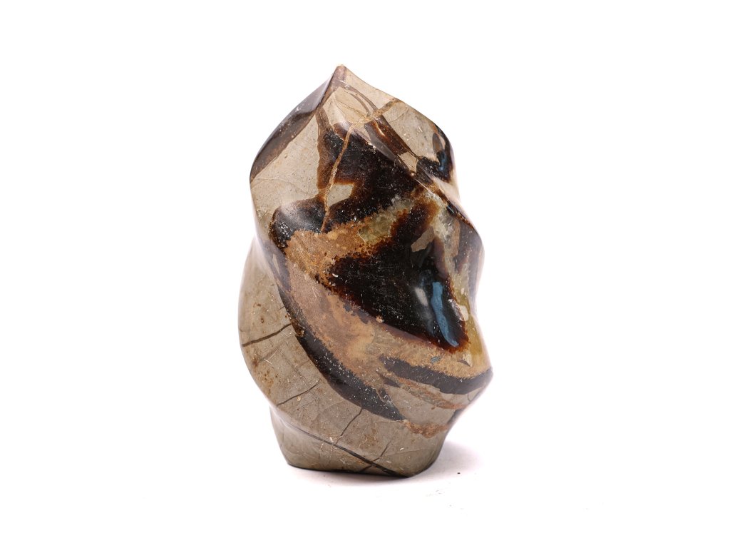 Plamen z přírodní septárie je jedinečný minerál, který upoutá svými charakteristickými kresbami v odstínech hnědé, žluté a šedé. Tyto zemité barvy vytvářejí jedinečný vzor připomínající praskliny zemské kůry. Kámen byl ručně opracován do tvaru plamene, čímž se stává harmonizujícím prvkem i originální dekorací pro váš domov nebo kancelář.