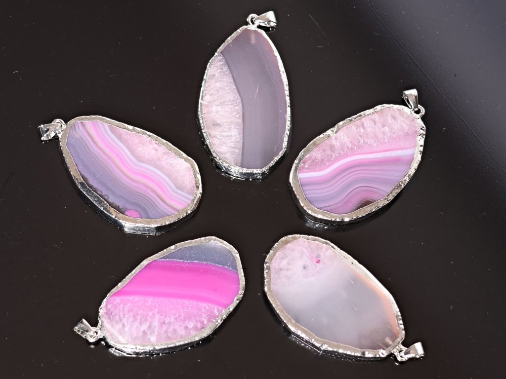 Luxusně působící přívěsky z přírodního achátu ve formě broušených plátků zaujmou nádhernými růžovo-fialovými odstíny a typickým achátovým pruhováním. Okraje kamene jsou pokovené do stříbrného tónu, což dodává přívěskům elegantní vzhled a zvýrazňuje přírodní strukturu kamene. Každý kus je naprostý originál – liší se tvarem, kresbou i intenzitou barvy.