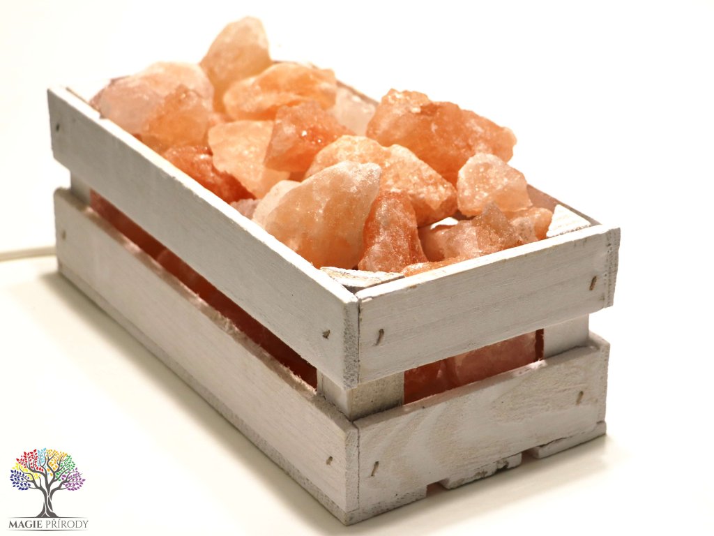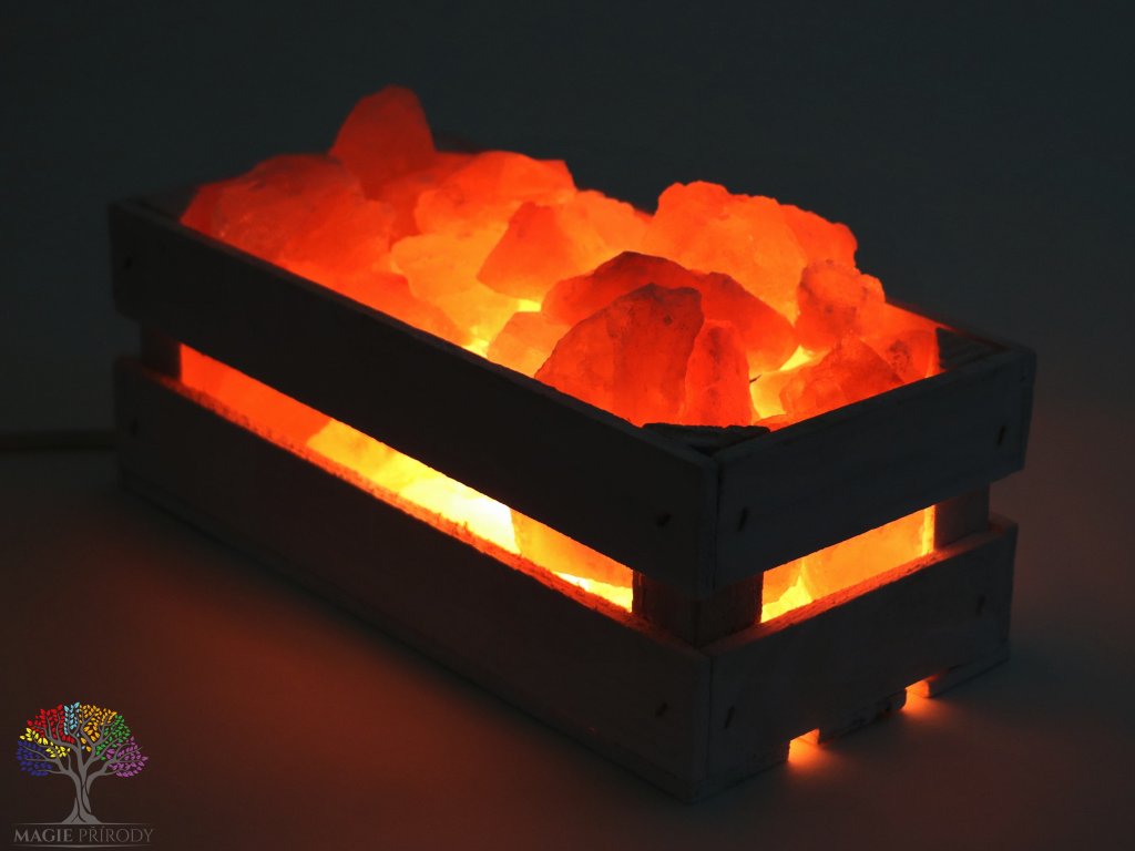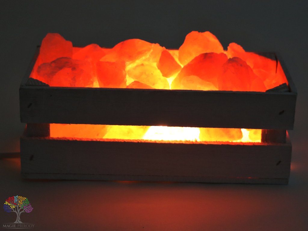 Solná lampa dřevěný koš. Elektrická solná lampa navozuje příjemnou atmosféru a blahodárně na lidský organismus.