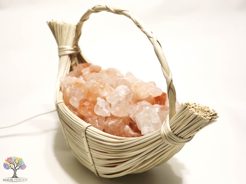 Solná lampa proutěný koš loďka. Elektrická solná lampa navozuje příjemnou atmosféru a blahodárně na lidský organismus.