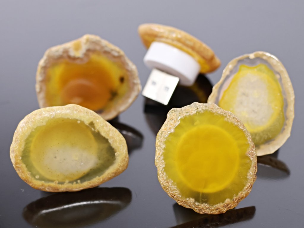 Achátová USB lampička – žlutý plátek achátu, teplé světlo a sluneční energie