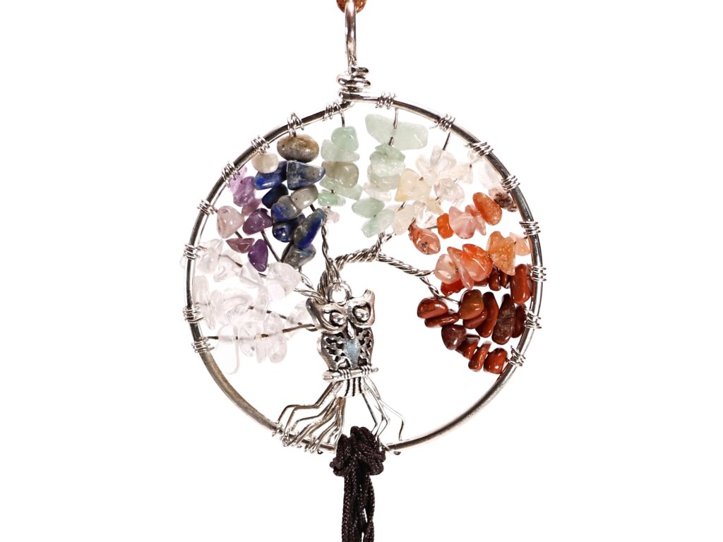 Tato nádherná ručně vyráběná závěsná dekorace spojuje symboliku Stromu života, ochranný symbol sovy moudrosti a sílu přírodních minerálů v barvách sedmi čaker. V horní části je kovový kruh se Stromem života posázený drobnými minerálními kamínky. Uprostřed je umístěna dekorativní sovička, která symbolizuje moudrost, vnitřní vedení a ochranu.