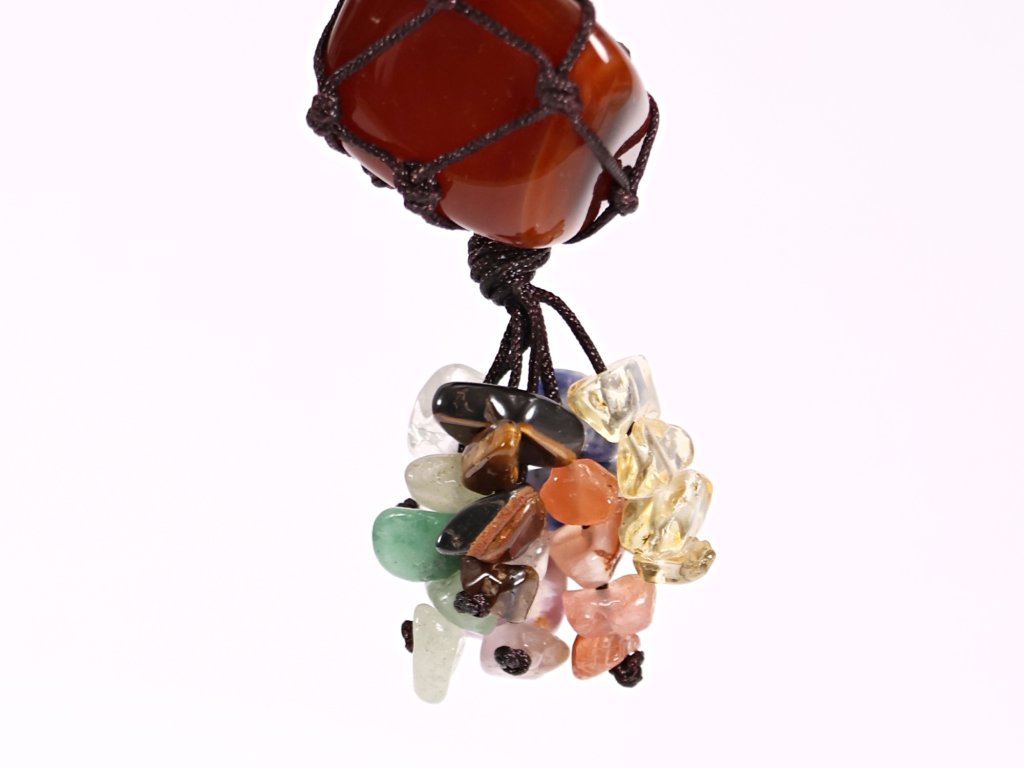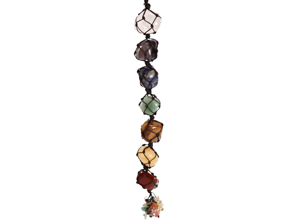 Na strom navazuje ručně spletený závěs s většími přírodními kameny, z nichž každý reprezentuje jednu čakru. Spodní část je zakončena shlukem drobných minerálu, které dekoraci dodávají jemnost, živost a energetickou sílu.
