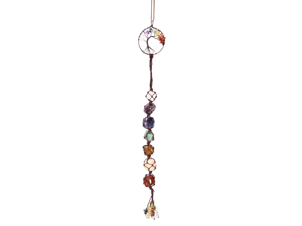 Tato nádherná ručně vyráběná závěsná dekorace spojuje symboliku Stromu života a sílu přírodních minerálů v barvách sedmi čaker. V horní části je kovový kruh se Stromem života zdobený drobnými minerály, na který navazuje ručně splétaný závěs s většími kameny reprezentujícími jednotlivé čakry. Spodní část je zakončena drobnými kamínky, které dekoraci dodávají jemnost a energetickou lehkost.